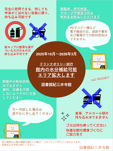 2025年10月1日(水)から2026年3月31日(金)の期間、図書館紀三井寺館はドリンクポリシーを試行することとし、館内の水分補給可能エリアを拡大します。館内での飲料摂取は、下記のとおり認めることといたします。